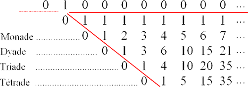 El Uno, surgido del conjunto vacío, por reproducirse, constituye el principio , manifestado en el triángulo de Pascal en el nivel de las mónadas (la serie de los enteros), detrás de la cual se encuentra la fila de las “nades”, el Uno como “reiteración de la falta” (159).