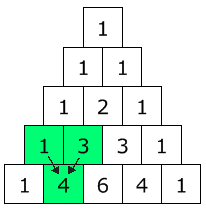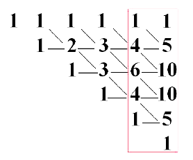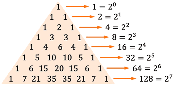 Es decir, tomando los 5 elementos, de a uno, tenemos 5 subconjuntos, tomando de a dos elementos, tenemos 10 subconjuntos, tomando de a tres elementos, tenemos también 10 subconjuntos, tomando de a 4 elementos, tenemos 5 subconjuntos, y agregando los coeficientes 1 en las diagonales de los bordes, que corresponden a la cantidad de subconjuntos que resultan de tomar 0 elementos (conjunto vacío) y 5 elementos (todos los elementos), tenemos la serie 1 – 5 – 10 – 10 – 5 – 1.Procediendo del mismo modo para un conjunto de cuatro elementos, “un tetraedro”, tendremos la serie 1 – 4 – 6 – 4 – 1.