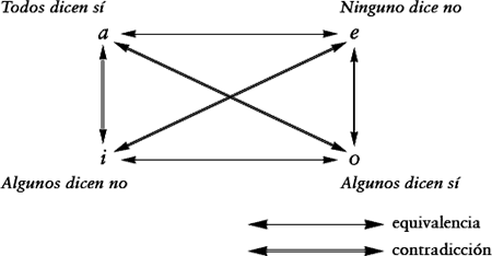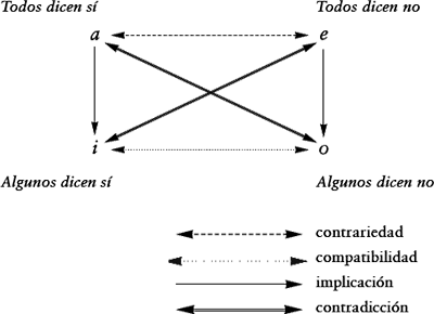 Este cuadrado permite precisar las relaciones lógicas entre esas proposiciones: contradicción, contrariedad, equivalencia, etc.Recordemos el cuadrado con las cuatro proposiciones, habitualmente indicadas con las letras A (universal afirmativa), E (universal negativa), I (particular afirmativa) y O (particular negativa