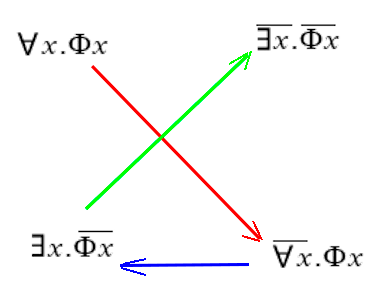 En la universal afirmativa tenemos “todo x verifica Φx”, en la universal negativa tenemos que “ningún x (no existe x que) no verifica Φx”, en la particular afirmativa tenemos que “algunos x (existe x que) no verifican Φx” y en la particular negativa “algunos (no todos) x verifican Φx”