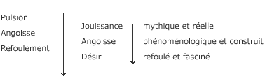 Cette doctrine est remise en question par le Séminaire de Langoisse où la jouissance passe par langoisse pour en venir au désir. Le terme de demande, cest la place de lamour, puisque, dans cette doctrine classique, il y a un dédoublement de la demande entre demande de satisfaction du besoin et demande damour. Dans cette doctrine classique, le signifiant est de lAutre au départ, alors que, dans la veine du Séminaire de Langoisse, il y a une référence à une monade mythique de la jouissance. Ce que Lacan clarifiera il reste là des formules ambiguës dans son écrit « Du Trieb de Freud » : « La jouissance est du côté de la Chose, alors que le désir est de lAutre. »xvii