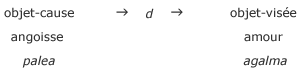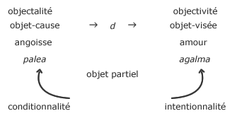 On trouve ici à distinguer lobjet-visée et lobjet-cause, celui-ci étant introduit dans ce Séminaire après avoir été ponctué au début de cette année dans lécrit « Kant avec Sade »vii. Lobjet-visée du désir est celui que lon peut mettre en scène dans le lien amoureux, alors que Lacan tente de faire apercevoir la fonction de lobjet-cause par langoisse.
