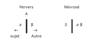 Ce quessaie de traduire ce schématisme élémentaire, cest que, chez le pervers, comme on le disait à lépoque, le petit a est à sa place, du côté du sujet, mais là où le sujet ne peut pas le voir. Cest du côté de lAutre que cela devient visible, alors que, du côté du sujet, il y a nescience, là où sinscrit à proprement parler lobjet petit a. Cest illustré, dans « Kant avec Sade », par la position de Sade lui-même qui signore en tant quobjet petit a, il ignore quil tient la place de lobjet.