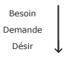 Jai évoqué tout à lheure la doctrine classique chez Lacan de l en deçà du désir. Cette doctrine passe par le besoin et la demande, elle prend comme primaire le besoin et suit le passage du besoin par la demande. Il en résulte le désir qui est comme un décalage entre besoin et demande.