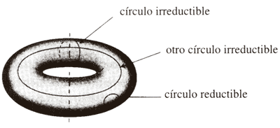 El caracter de reductible o irreductible del agujero hace a la cuestión de si puede llenarse o no, de si puede colmarse. La posibilidad de colmar un agujero "es representable como el estrechamiento de un círculo" (6). Como se ve, hay dos círculos que delimitan agujeros que, estirando la superficie, pueden reducirse hasta desaparecer, y dejar el toro en su forma inicial. Son los casos del circulo sobre la superficie y del círculo que corta el anillo. En cambio hay otro círculo irreductible, que es el que abarca el hueco central, que no puede reducirse porque desarma el toro, transformándolo en una superficie rectangular.