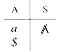 La relación de a con S (el sujeto del nivel mítico anterior a la operación del significante) - donde a es "aquello que representa al S en su real irreductible" (4) - es lo que completa la operación de la división (ya que el A no tiene común denominador con respecto a a y S), obteniendo como resto final el $.