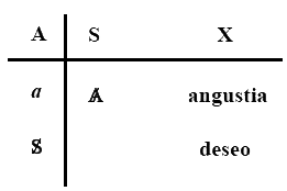 (página 176 de Paidós)Asi tendremos, "al principio una x que solo podemos nombrar retroactivamente, que es, propiamente hablando, el acceso al Otro, el punto de mira esencial en que el sujeto debe situarse", al que sigue "el nivel de la angustia, constitutivo de la aparición de la función a", y finalmente, "el $ como sujeto del deseo" (7)
