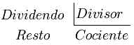 cuya operación consiste en averiguar cuántas veces un número (el divisor) está contenido en otro número (el dividendo). Al resultado entero de la división se denomina cociente y si la división no es exacta, es decir, si el divisor no está contenido un número exacto de veces en el dividendo, la operación tendrá un resto o residuo.