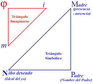 Lacan distribuye esta situación sobre el esquema de triángulos imaginario y simbólico, respecto de los cuales ha indicado que "si el sujeto llega en lo vivido a darle tal o cual sentido a lo que le es dado por su fisiología humana particular, ello se estructura siempre en esta relación triádica constituida en el plano del significante" (11). En dicho esquema, el término "niño deseado" corresponde a la constitución de la madre en cuanto sede del deseo. Y es en la relación a su propia imagen que "el sujeto encuentra la duplicidad del deseo materno en su relación a él como niño deseado, que no es sino simbólica" (12).