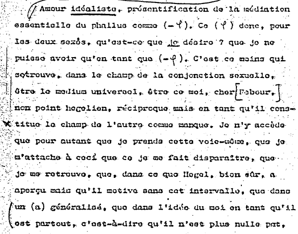 Este menos, querido Reboul, no es en absoluto hegeliano, no es en absoluto recíproco. Constituye el campo del Otro como falta, y sólo accedo a él en la medida en que tomo esta misma vía y me atengo a lo siguiente: al hecho de que el juego del menos me hace desaparecer.