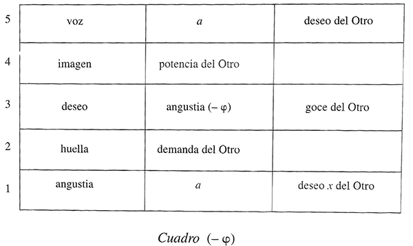 , por donde "el momento de avance del goce, del goce del Otro y hacia el goce del Otro, comporta la constitución de la castración como prenda de ese encuentro" (11), en el siguiente cuadro.