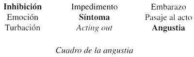 Esto lo lleva a completar los lugares vacios del cuadro de la angustia, con los siguientes términos: el "acting out" y el "pasaje al acto".