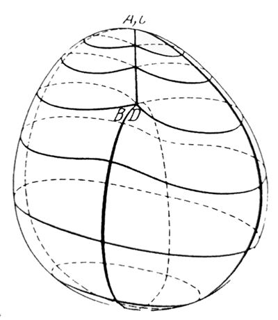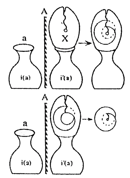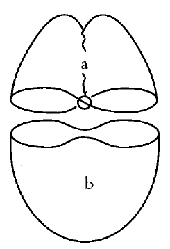 El cross cap no puede dibujarse pura y simplemente como algo que estaría dividido en dos por una línea donde se entrecruzarían las dos superficies (a). Debe quedar aquí (b) algo que, más allá del punto, lo envuelva, algo como una circunferencia, tan reducida como sea, una superficie que permita comunicar los dos lóbulos superiores de la superficie así estructurada (14).