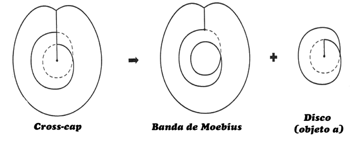 Cuando realizamos el corte del 8 interior, la banda de Moebius es el sujeto revelado por el corte, y el disco residual del corte es el resto no moebiano escondido en el cross-cap, el objeto a.