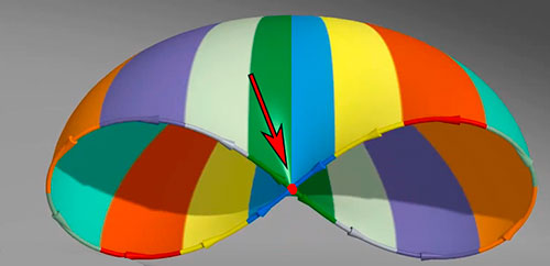 La construcción de este video también nos permite imaginar esa construcción de la a-esfera sin seguir todos los pasos del plano proyectivo, pensando ese borde que resultó del pliegue de una mitad de la esfera sobre la otra, como un simple agujero sobre la esfera. En ambos casos tenemos la situación que ilustra el video que consiste en cómo unir los puntos antipódicos del borde de ese agujero. De hecho, ese conjunto de puntos que conforman el borde de ese agujero, solo pueden funcionar como antipódicos si hay dos puntos privilegiados que se unifican en un punto doble (señalado con flecha y punto en la siguiente imagen tomada del video anterior).