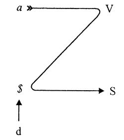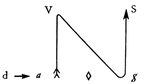 Al reseñar los términos del 1º esquema, Lacan ya había asociado (en la versión de 1966, pero no en la de 1963) la parte inferior de ese rombo perdido, con la V: "Queda la V que ocupando en ese sitio una elevada posición parece imponer la voluntad que domina todo el asunto, pero cuya forma también evoca la reunión de lo que divide reteniéndolos unidos con un vel, a saber, dando a elegir lo que hará el $ (S barrado) de la razón práctica con el S sujeto en bruto del placer (sujeto "patológico")" (68).En consecuencia, en el primer esquema, los términos a y $ tenían dos vías de determinación: la del rombo (configurando la "línea del fantasma") y la de la V (siguiendo la línea sinuosa). Según Allouch, podemos asociar las lecturas de Blanchot y Lacan a cada una de estas determinaciones. En Blanchot, no hay rombo, solo línea sinuosa. En Lacan, en cambio, la inscripción del rombo "heterogéneo con respecto a la línea sinuosa de la causalidad, inscribe que el fantasma interviene según una lógica que no es solamente la lógica pura de la voluntad de goce" (69)