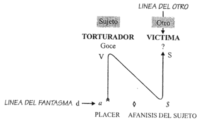 Las posiciones del torturador son las del primer tramo el vector: la voluntad de goce V en el nivel del Otro, y el placer, retroactivo, al inicio.