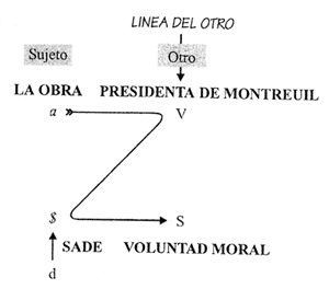 El segundo esquema implica una puesta fuera de juego del fantasma sadiano (al desaparecer el rombo que articulaba a y $, en la "línea del fantasma"). Y la voluntad de goce, que en el primer esquema tenía el carácter de la razón pura, en este segundo esquema se vuelve patológica, convirtiéndose en "la constricción moral ejercida implacablemente por la Presidenta de Montreuil sobre el sujeto respecto del cual se ve que su división no exige ser reunida en un solo cuerpo" (71)