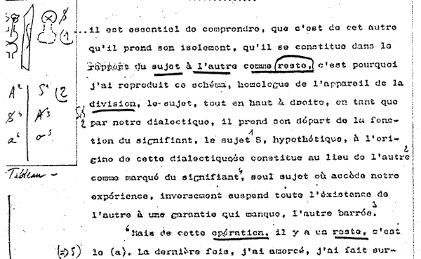 Es decir, "el sujeto tachado (...) se constituye en el lugar del Otro como marca significante (...) Pero de esta operación hay un resto, es el a" (3)