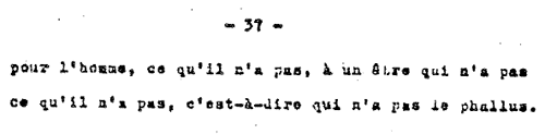 Esto puede traducirse del siguiente modo: "de lo que se trata, según la definición misma del amor, es de dar lo que no tiene, es de dar, para el hombre, lo que no tiene, a un ser que no tiene lo que él no tiene, es decir, que no tiene el falo"