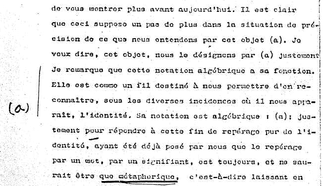 (pág. 102)"Il est clair que ceci suppose un pas de plus dans la situation de précision de ce que nous entendons par cet objet (a). Je veux dire, cet objet, nous le désignons par (a), justement. Je remarque que cette notation algébrique a sa fonction. Elle est comme un fil destiné à nous permettre d'en reconnaître, sous les diverses incidences ou il nous apparaît, l'identité. Sa notation est algébrique: (a); justement pour réponde à cette fin de repérage pur de l'identité, ayant été déjà posé par nous que le repérage par un mot, par un signifiant, est toujours, et ne saurait être, que métaphorique" "C'est ce que nous allons nous efforcer de vous montrer plus avant aujourd'hui, précisant ce que nous entendons par cet objet a.