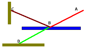 Por este carácter semi transparente de la superficie (plano azul en el gráfico), el rayo de luz proveniente de A, al llegar al punto B, se fracciona : una parte continua su camino hasta llegar a D, y la otra parte se refleja hasta C.