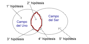 Esto es lo que creo que Miller no percibe, y por eso su esquematización de las 4 primeras hipótesis (que para él son 5) con los círculos de Euler, se ordena en términos de relaciones entre el campo del Uno y el campo del Ser. En ese sentido, su ambición de presentar sus desarrollos sobre el Parménides como la revelación al fin de lo que sería "la doctrina secreta de Lacan sobre el Parménides", no hace mas que subrayar, a mi modo de ver, el punto que a él mismo se le escapa. Y ese punto que se le escapa es la cuestión de la lógica del no-todo que allí está planteada.