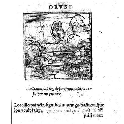 Lacan también elige la gráfica de la tapa, "la oreja y el puente": "un emblema extraído de una colección del siglo XVI que se presenta ingenuamente como la clave de la escritura egipcia, a saber, la oreja y el puente que aluden en más de un sentido a la función analítica" .