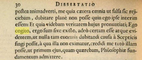 "Sed statim | postea animadverti, me quia caetera omnia ut falsa sic rejiciebam, dubitare plan`e non posse quin ego ipse interim essem: Et quia videbam veritatem hujus pronuntiati; Ego cogito, ergo sum sive existo, ade`o certam esse atque evidentem, ut nulla tam enormis dubitandi causa `a Scepticis fingi possit, `a qua illa non eximatur, credidi me tut`o illam posse, ut primum ejus, quam quaerebam, Philosophiae fundamentum admittere";