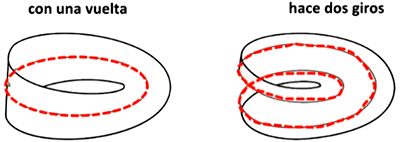 Si mantenemos cierto ancho de esa banda, veremos que tras el corte, ya no tendremos la superficie de Moebius (de una sola cara, es decir, no orientable, con un solo borde) ya que la superficie resultante pasa a tener un derecho y un envés (dos caras, orientable).