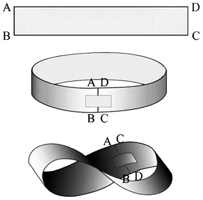 En cambio, si pegamos A con C y B con D, entonces tendremos una superficie de Moebius, que es unilateral, tiene un solo lado, a pesar de estar representada en tres dimensiones.