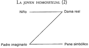 Ella sostiene esa relación idealizada con aquello que de su ser de mujer es insuficiencia, dando lo que no tiene, y así transforma su castración (-φ) en Φ, el falo absoluto, la garantía de la ley del padre.Esto es lo que instrumenta y sostiene la escena del amor a la "dama", como un acting-out, donde lo que permanece escondido en esa escena es para quién se monta: la mirada del padre. Por eso la situación no se sostiene luego del encuentro: la escena no puede confrontarse con la mirada. La escena solo puede sostenerse en la medida en que esa mirada está ausente; convocada, imaginada, pero ... ausente. El sujeto, como a, está en el cuadro de amor de la joven homosexual con su dama, "potencialmente ofrecido a la mirada del padre", en aquello que, de ese cuadro, es portador , es decir, el don del falo a la dama, un falo que no está negativizado, sino que por el contrario, se escribe Φ.