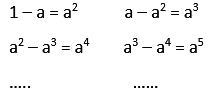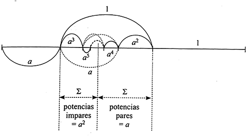 Si como hicimos previamente con el a respecto del 1, ahora plegamos el a2 en sentido inverso, resulta una nueva diferencia, es decir (a - a2), que es fácil demostrar que es igual a a3. Y si luego plegamos el a3 nuevamente hacia la derecha tendremos (a2 - a3), que también es fácil demostrar que es igual a a4. Y así sucesivamente resultan dos series (tomando siempre el resto como operación) con las potencias pares e impares, que convergen, desde cada lado, a un encuentro de ambas, hasta totalizarse como 1.