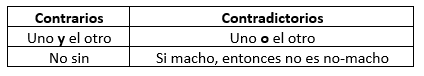 El contrario, que es "uno y el otro" ("macho y hembra"), se opone al contradictorio, que es "uno o el otro".