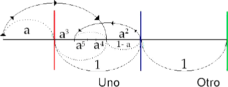 Si ahora reportamos ese a2 sobre a, resulta un a3, el cual, con el mismo procedimiento respecto del a2, nos da a4, y así sucesivamente, obteniendo todas las potencias pares de un lado, al encuentro de todas las potencias impares del otro, cuya sumatoria realiza el 1.