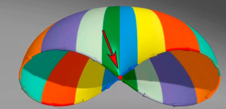 De hecho, ese conjunto de puntos que conforman el borde de ese agujero solo puede funcionar como antipódicos (y pretender a su reunión) si dos de estos puntos (privilegiados en esta elección) se unifican en un “punto doble” (señalado con flecha y punto en la siguiente imagen tomada del video anterior).
