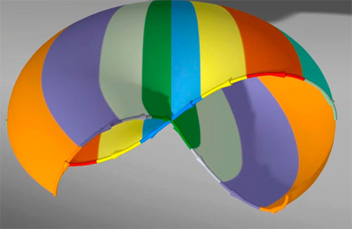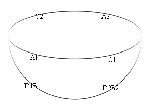 Proyección (pliegue) de una mitad de la esfera sobre la otraEl paso clave, ahora, es cómo unir los puntos opuestos de esa circunferencia (ecuador de la esfera) de modo que permita el entrecruzamiento de la superficie y la construcción del cross-cap sobre esa semiesfera...