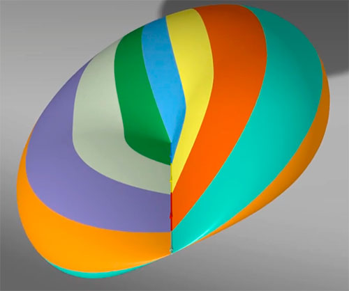La unión de esos puntos "antipódicos" (verde con verde, blanco con blanco, violeta con violeta, etc.) nos da una especie de "costura" de ese agujero inicial en la esfera, donde esta nueva superficie resultante sostiene, no el agujero, pero si “el lugar del agujero” .