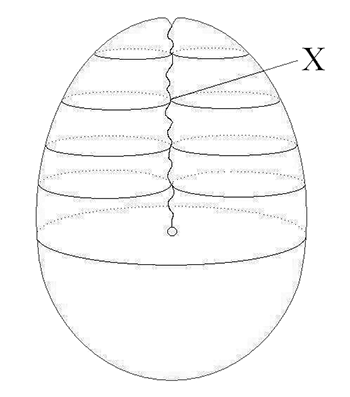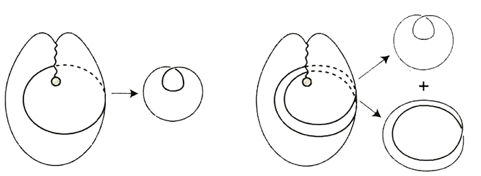 El cross-cap no puede dibujarse pura y simplemente como algo que estaría dividido en dos por una línea donde se entrecruzarían las dos superficies (a). Debe quedar aquí (b) algo que, más allá del punto, lo envuelva, algo como una circunferencia, tan reducida como sea, una superficie que permita comunicar los dos lóbulos superiores de la superficie así estructurada .