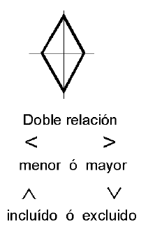 Volviendo a la articulación lógica del fantasma, el vínculo de la fórmula se escribe con un "rombo", al que Lacan denomina también "punzón" (“poinçon”): "un signo forjado expresamente para conjugar en él lo que puede aislarse de él según se lo separe mediante con un trazo vertical o mediante un trazo horizontal" (11). Si lo separamos por un trazo vertical tendremos una doble relación, mayor ( > ) o menor ( < ), "$ mayor que, o también menor que a". Y si lo separamos por un trazo horizontal, tendremos las relaciones V y Ʌ, que Lacan refiere como inclusión y exclusión, "$ incluido, o también excluido, de a" (1).