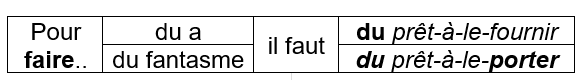 Pero esto no alcanza para aquello sobre lo que quiere avanzar. Por eso, complementa señalando que “para hacer fantasma”, “pour faire du fantasme”… …se necesita “listo para portar”, "du prêt-à-le-porter".En las dos frases, Paidós traduce el “faire” (“hacer”) de la primera parte de las frases, por “obtener” (sea para ”a” o sea para “fantasma”). Ya en la página 10 vimos que Lacan plantea que la “lógica del fantasma”, “la hace”.