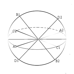 Proyección del haz infinito de rectas sobre la superficie de la esferaPero con esta construcción, a cada recta que pasa por el punto de cruce inicial le corresponden dos puntos opuestos sobre la superficie de la esfera. Y lo que quiero lograr es una proyección sobre un plano, es decir, que a cada recta le corresponda un solo punto. Para eso, ahora pliego la esfera por su ecuador hundiendo una de sus "mitades" hasta superponerla con la otra mitad. De ese modo puedo juntar cada par de puntos de cada recta en un solo punto, sobre una sola superficie (en una especie de semiesfera), salvo en el ecuador, donde sigo teniendo dos puntos por cada recta.
