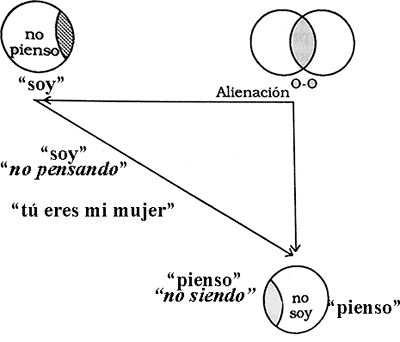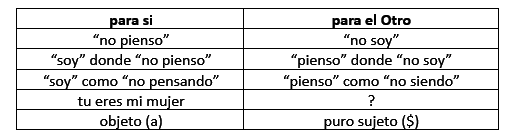 Puesto que la exigencia fundamental del acto sexual es que el sujeto no pueda ser "para sí", la oposición al "en sí" sería un "para el Otro", el lugar desde donde el mensaje le retorna en forma invertida (312).Aplicándolo a las formulaciones previas del esquema cuadrangular del grupo de Klein y la alienación, podríamos decir que el "no pienso" es el "en sí" (del ser macho o del ser mujer), y que el "no soy" se ubicaría del lado del "para el Otro".