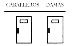 En el siguiente esquema, el de las puertas gemelas, lo que ocurre es que “redoblando únicamente la especie nominal sólo por la yuxtaposición de dos términos cuyo sentido complementario parece deber consolidarse por ella”, “se produce la sorpresa de una precipitación de sentido inesperada” (10): en el lugar del “concepto”, la imagen de dos puertas “gemelas” vienen a simbolizar el imperativo de la “segregación urinaria”.