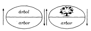 …que Lacan resume en el esquema del “árbol”, donde se ha producido la eliminación de la elipse e inversión de las posiciones del significante y el significado con relación a la barra resistente, pero donde lo que está en juego no es solo el significado sino el significado en tanto “concepto”, es decir, la referencia a la cosa, al objeto o referencia.