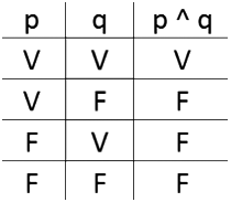 De ahí las habituales "tablas de verdad".Por ejemplo, para dos proposiciones, p y q, la tabla correspondiente a la conectiva de la conjunción (que solo es verdadera si las dos proposiciones también lo son) será la siguiente: