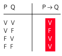 Se define la “implicación” como “el enlace entre una prótasis y una apódosis, tomadas dentro del mismo paréntesis” (56). No significa una causa, es el vínculo donde se unen, de cierta manera, respecto a la tabla de verdad, la prótasis y la apódosis. En este caso, una prótasis verdadera y una apódosis también verdadera, constituyen un vínculo verdadero.Pero, a diferencia de la conjunción (tabla de verdad anterior), para una prótasis falsa y una apódosis verdadera, los estoicos dirán que esto es verdadero porque es precisamente "ex falso sequitur quodlibet" (7), es decir, que de lo falso puede implicarse tanto lo verdadero como lo falso. Consecuentemente, no hay ahí objeción lógica.