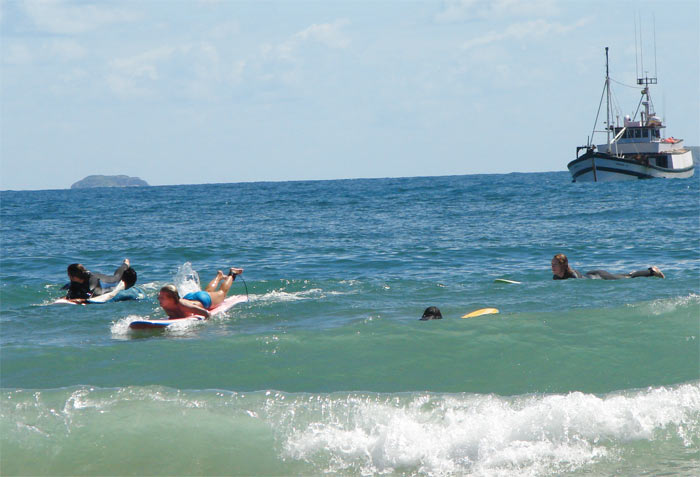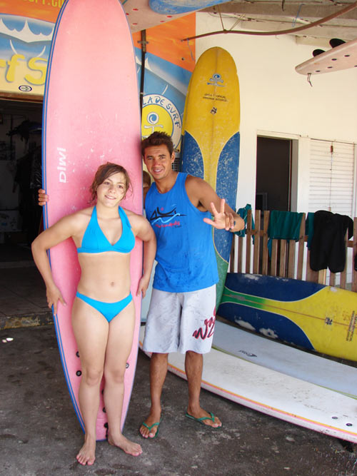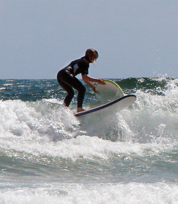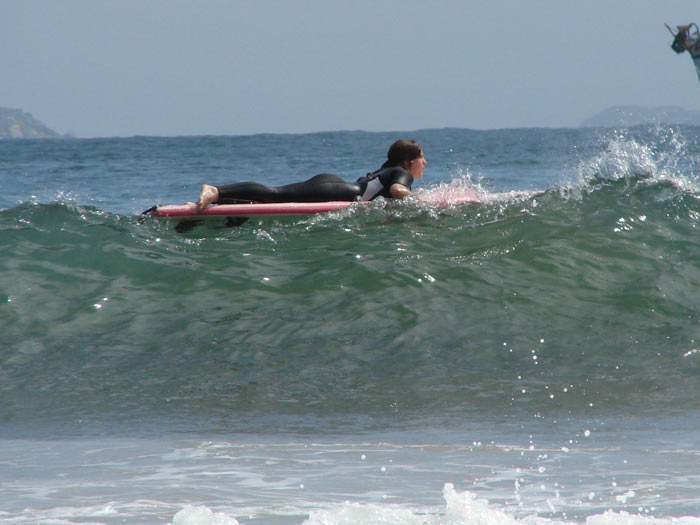 Sosteniendo la tabla de otro surfista que se le vino encima.