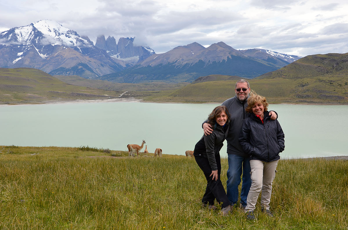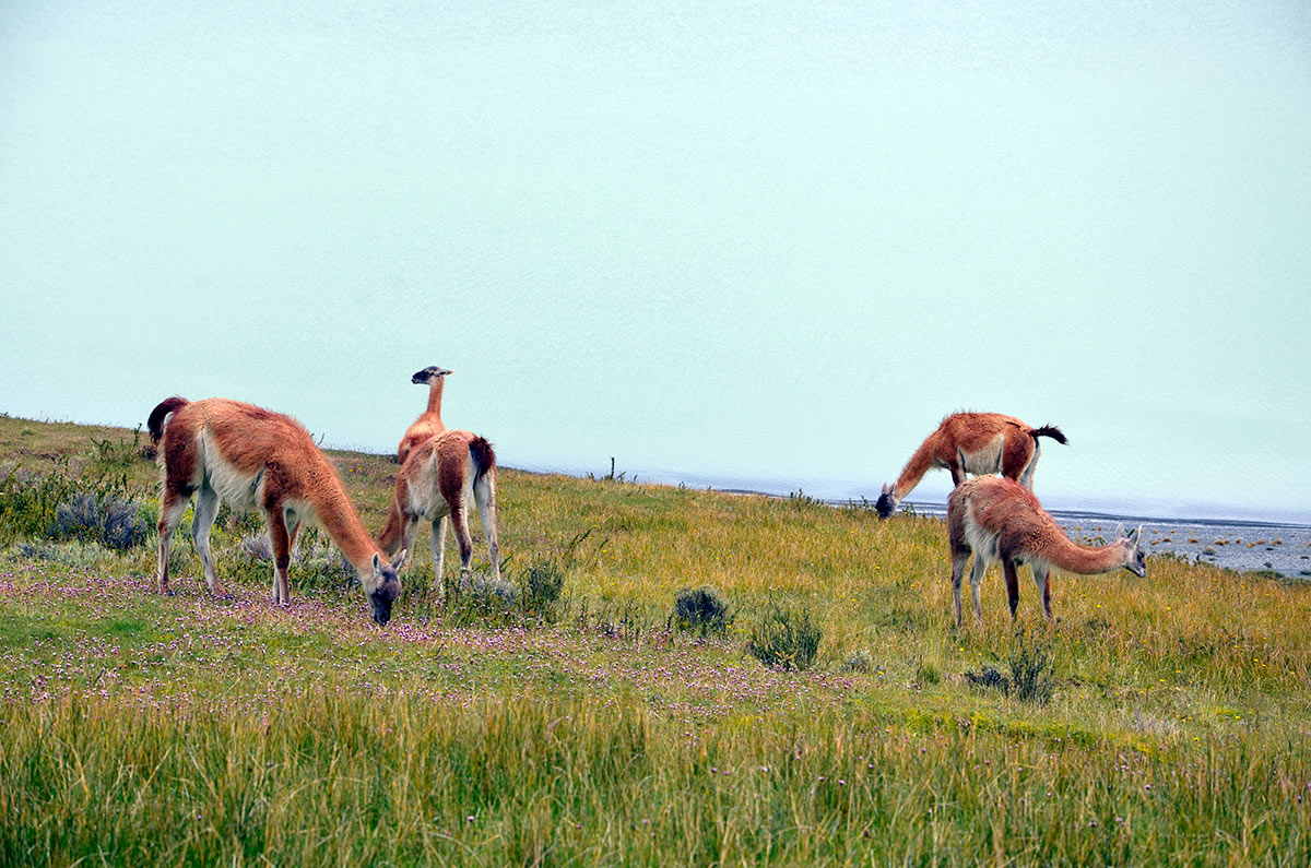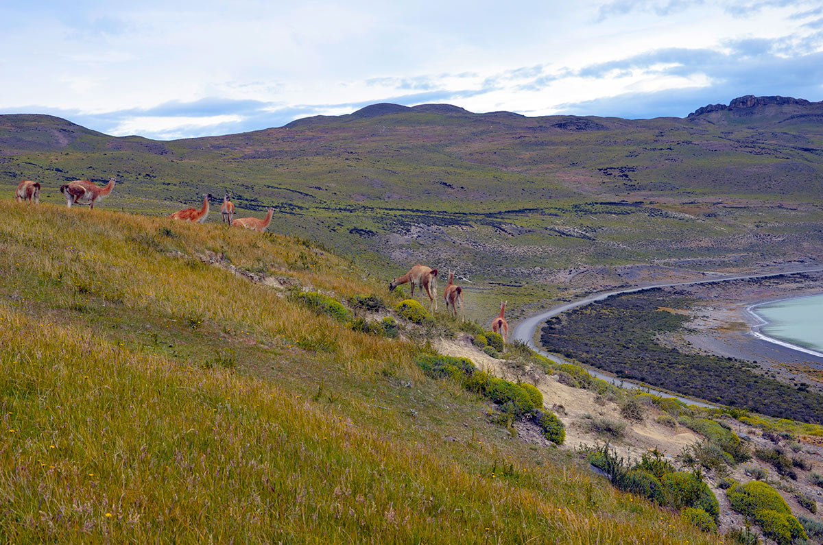 Guanacos y torres de Paine desde la Laguna Amarga