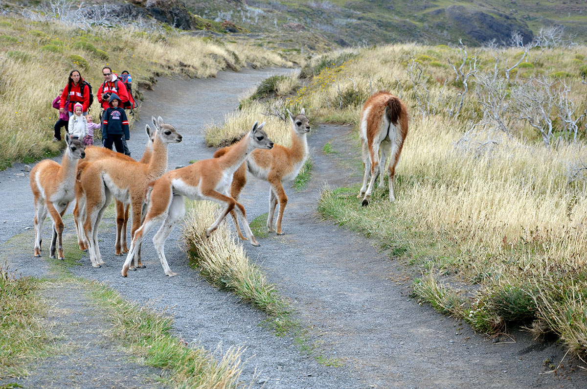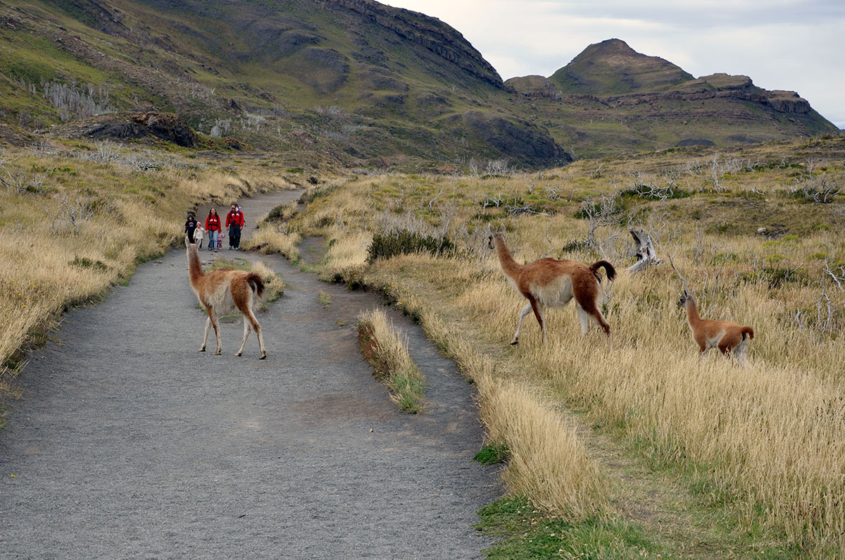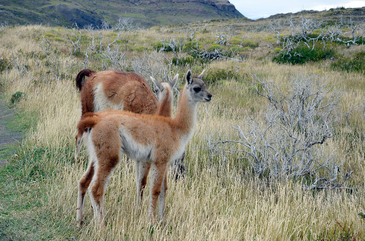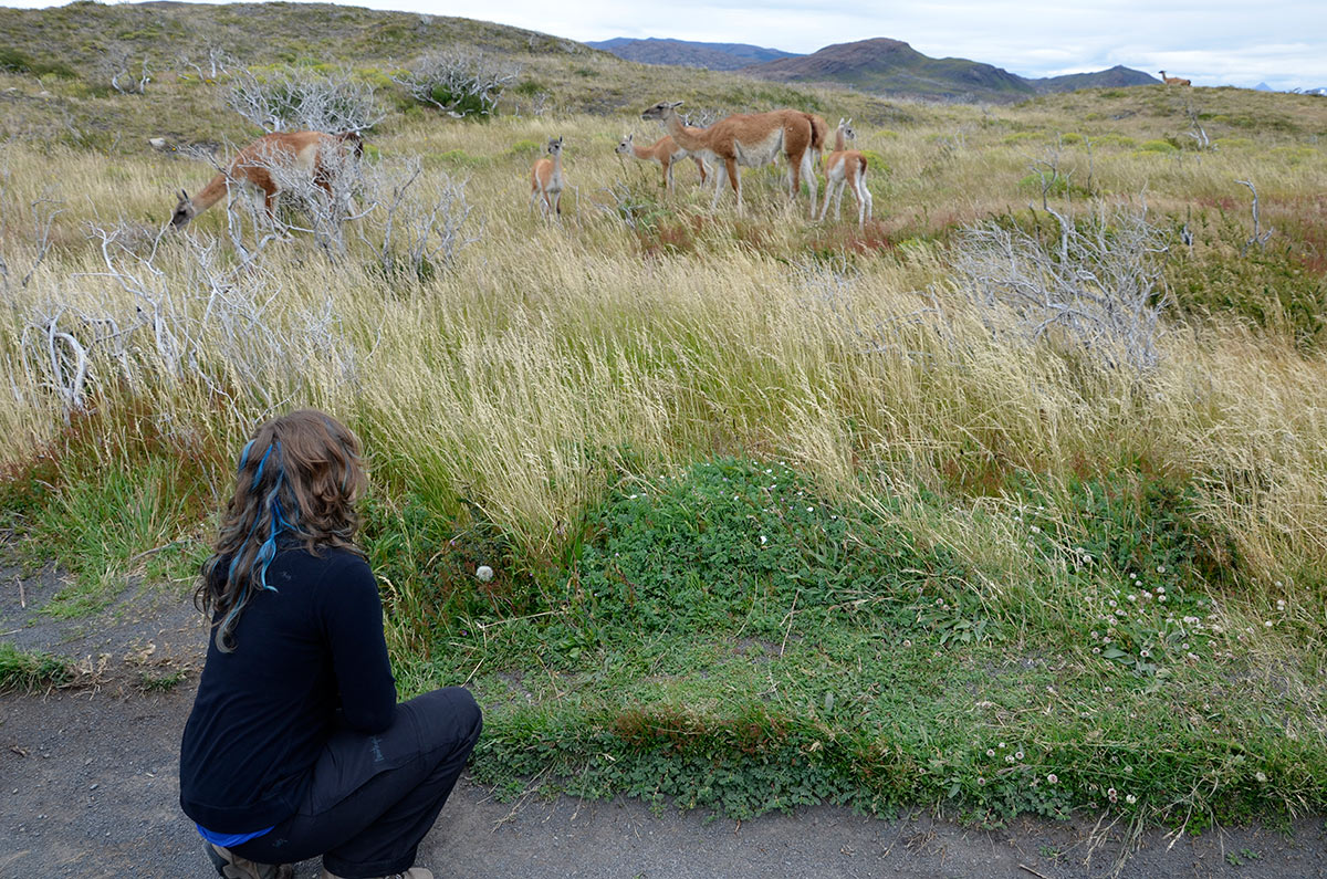 Guanacos y torres de Paine desde la Laguna Amarga